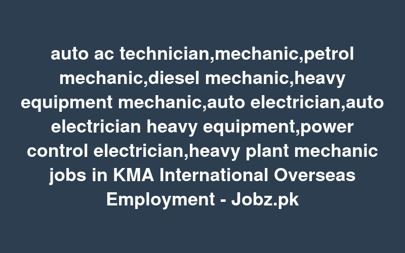 Check out this new career opening for auto ac technician,mechanic,petrol mechanic,diesel mechanic,heavy equipment mechanic,auto electrician,auto electrician heavy equipment,power control electrician,heavy plant mechanic jobs in KMA International Overseas Employment - Jobz.pk in Pakistan. Review full details and apply.