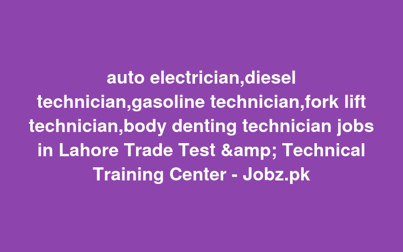 Check out this new career opening for auto electrician,diesel technician,gasoline technician,fork lift technician,body denting technician jobs in Lahore Trade Test & Technical Training Center - Jobz.pk in Pakistan. Review full details and apply.